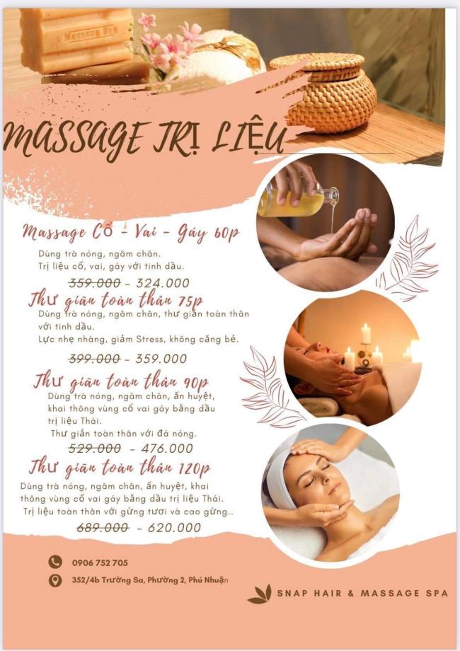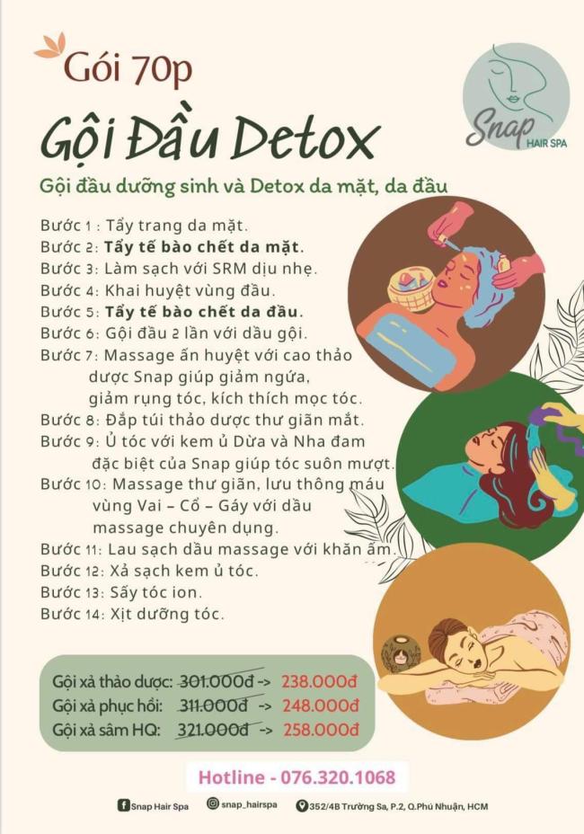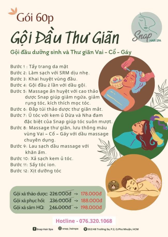 Cuộc sống hối hả nhộn nhịp khiến bạn căng thẳng, có nhiều âu lo. Vào cuối tuần, bạn cần một nơi để thỏa mãn, thả lỏng cơ thể và giải tỏa căng thẳng tuyệt đối. SNAP Hair Spa cung cấp dịch vụ gội đầu dưỡng sinh chuyên nghiệp sẽ giúp bạn bảo vệ sức khoẻ bằng phương pháp dưỡng sinh đông y, massage bấm huyệt, kết hợp với thảo dược từ thiên nhiên.